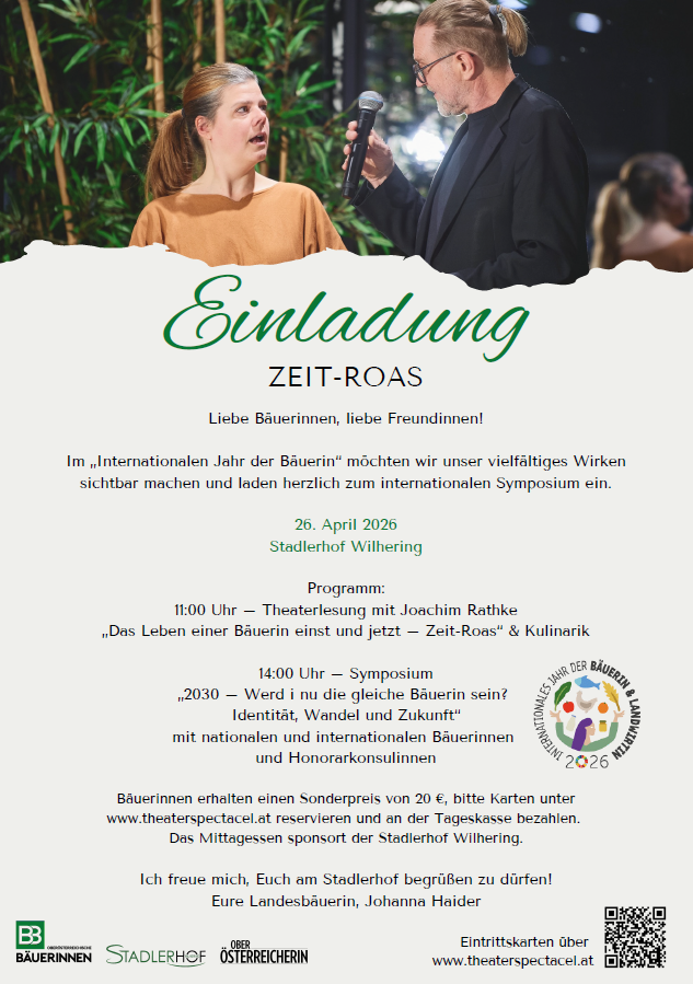 Im „Internationalen Jahr der Bäuerin“ lädt Landesbäuerin Johanna Haider am 26. April 2026 zu einer ganz besonderen Veranstaltung auf den Stadlerhof Wilhering ein. Die ZEIT-ROAS verbindet eindrucksvoll Kultur, Geschichte und Zukunftsperspektiven – und stellt dabei das Leben von Bäuerinnen in den Mittelpunkt.